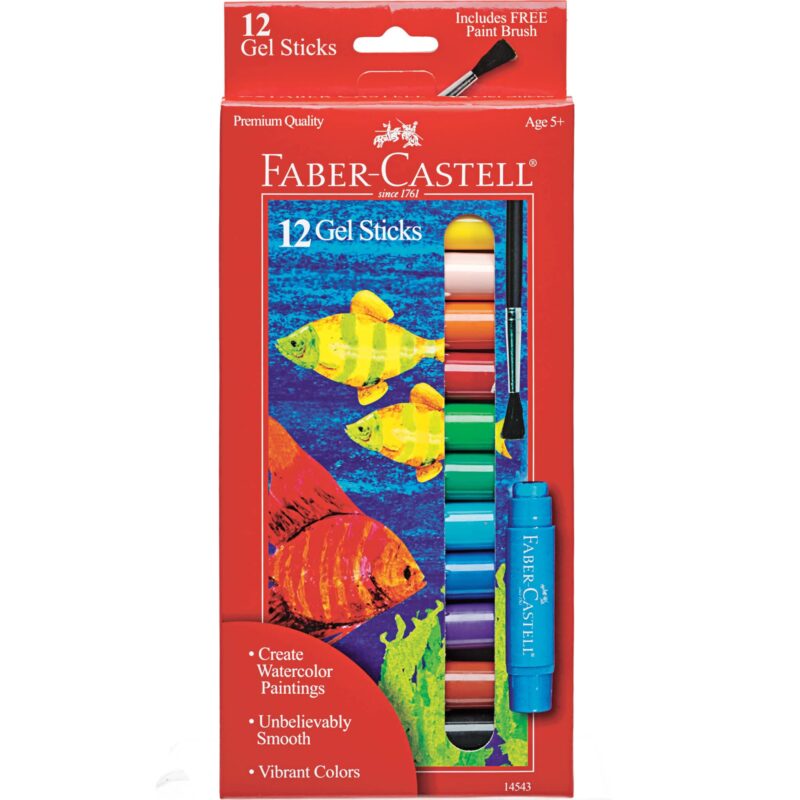 Contents Include: 12 Gel Sticks: Red, Blue, Green, Yellow, Orange, White, Black, Brown, Turquoise, Purple, Peach and Dark Green in a box. Includes 1 paintbrush.