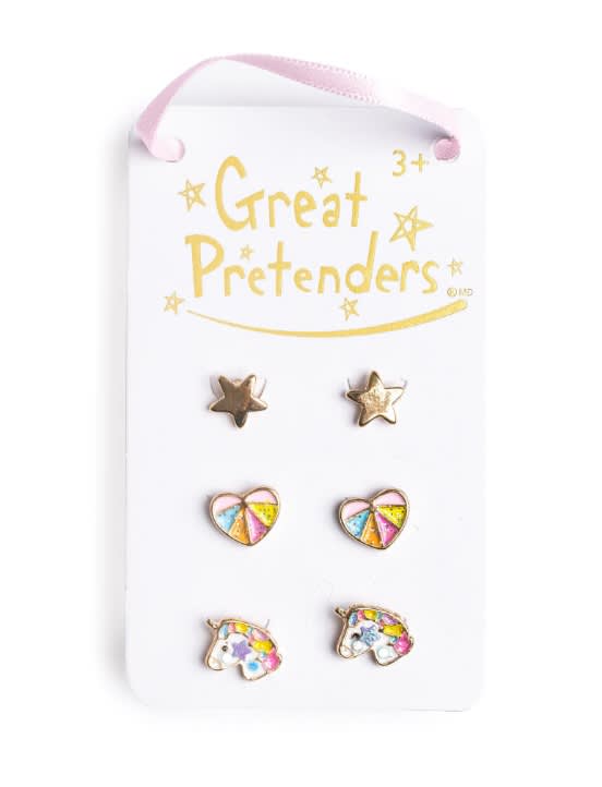 You’re sure to be all smiles while sporting our Cheerful Studded Earrings. Perfect for pierced ears, this 3-pair set consists of a metallic star, pastel rainbow heart, & unicorn designs.