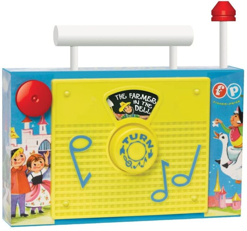 It’s the Farmer-in-the-Dell! The Fisher-Price, Two Tune Music Box TV has been stimulating the eyes and ears of children for generations. Just wind the knob to hear the melody while whimsical scenes scroll across the window. Since 1930, Fisher-Price has been in business to create toys that fascinate and stimulate a child’s imagination.