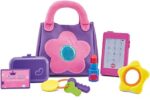 My First Purse includes a bunch of items for in-depth pretend play, including the cute purple hand bag with a bright pink flower, a play cellphone, keys, wallet, pretend lipstick, unbreakable mirror, and a debit card.
