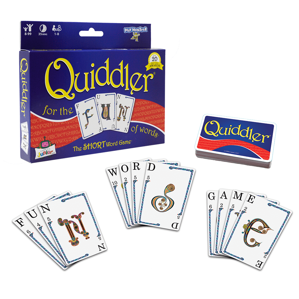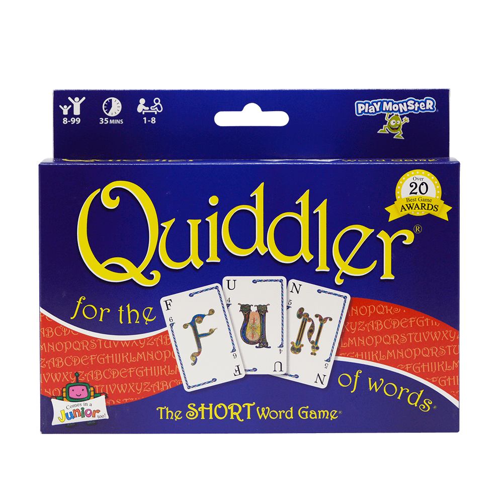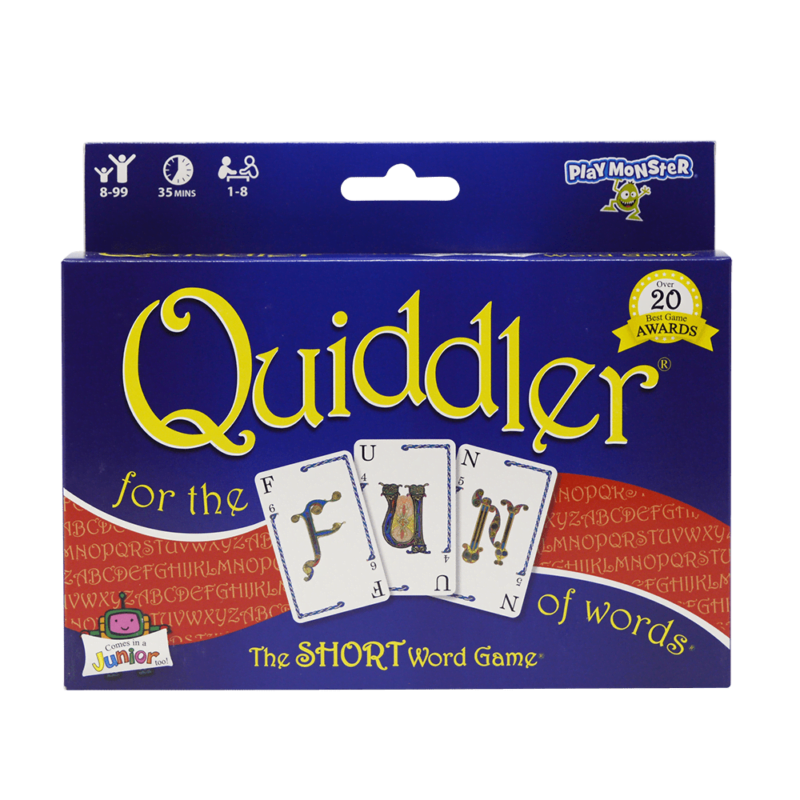 Quiddler is easy to learn and fun for everyone! Because it’s The SHORT Word Game®, it attracts non-word-game players as well as people who love word games! The goal is to arrange all the cards in your hand into one or more words. The number of cards dealt increases each round – starting with three cards and ending with 10 cards. High score wins, so use your high point letters and Quiddler’s unique double letter cards — but don’t get caught with them in your hand! Aim for the bonuses—one for the most words and one for the longest word! It’s great for families and parties! Plus, it sharpens skills like spelling, vocabulary and critical thinking, so teachers love it, too! For 1 to 8 players.