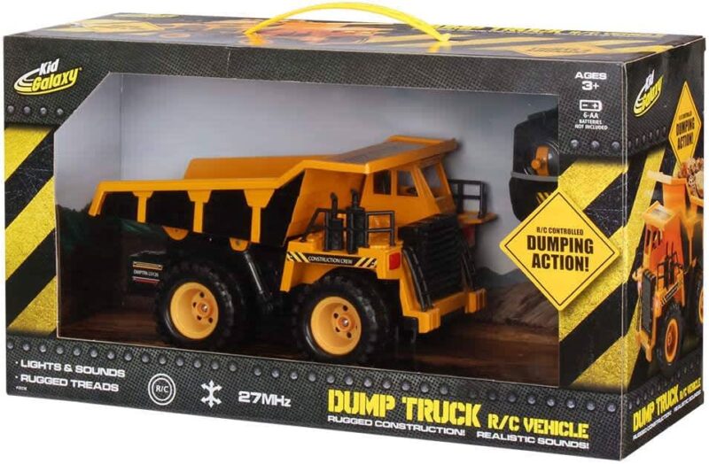 Fill the dump truck bed with small toys, dirt, sand, sticks, gravel – anything. Then use the fully functional radio controls to drive to your dump site! 6 Functions: Drive forward, backward. Turn left, right. Raise and lower dump truck bed. Realistic scale and details make this earth mover looks as if it’s a real life, heavy-duty dump truck.