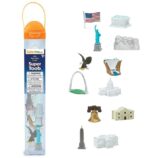 This Toob includes figurines of the Lincoln Memorial, Hoover Dam, Liberty Bell, Alamo, Mount Rushmore, Statue of Liberty, Gateway Arch, U.S. Capital, Empire State Building, White House, as well as a flag and an eagle.